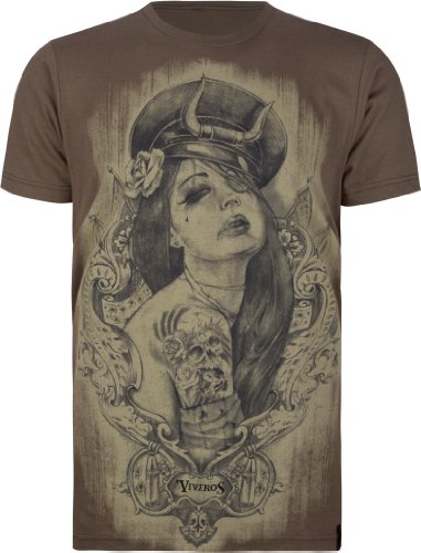 Viveros Captain Howdy tee. Brian Viveros artwork of female military captain printed on front. Short sleeve. Crew neck. 100% cotton. Machine wash. Imported.Celebrated fetish artist Brian M. Viveros is internationally embraced for his erotic paintings of doe-eyed beauties. His paintings are a drunken mix of oil, airbrush, acrylic, and ink. In his work Viveros shines a light on his own inner world and society at large and aims to captivate even the most jaded eyes.