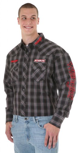 This men's western Wrangler¨ Logo Shirt has a Red/Black plaid patern with Snap Flap Pockets. Wrangler¨ Embroidery Over Right Pocket, on Collar and Down Sleeve. PBR Bar Logo Over Left Pocket and PBR on Back Yoke.